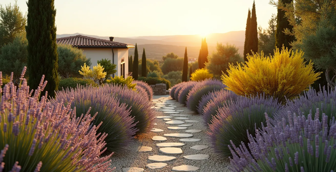 Creare un’associazione vegetale vincente in un giardino secco non è solo una questione di sopravvivenza, ma di vera e propria sinfonia visiva e olfattiva. Lavanda, rosmarino e ginestra non sono solo piante resistenti, ma i pilastri di un design mediterraneo che gioca con forme, texture e colori. L’errore comune è piantarle a caso; il segreto è usarle come strumenti di progettazione per creare un “ecosistema resiliente”. La lavanda offre macchie di colore viola e una forma a cuscino, il rosmarino (specialmente le varietà prostrate) può ricadere da muretti o coprire il suolo con il suo fogliame aromatico, mentre la ginestra aggiunge una verticalità scultorea e un’esplosione di giallo luminoso in primavera.